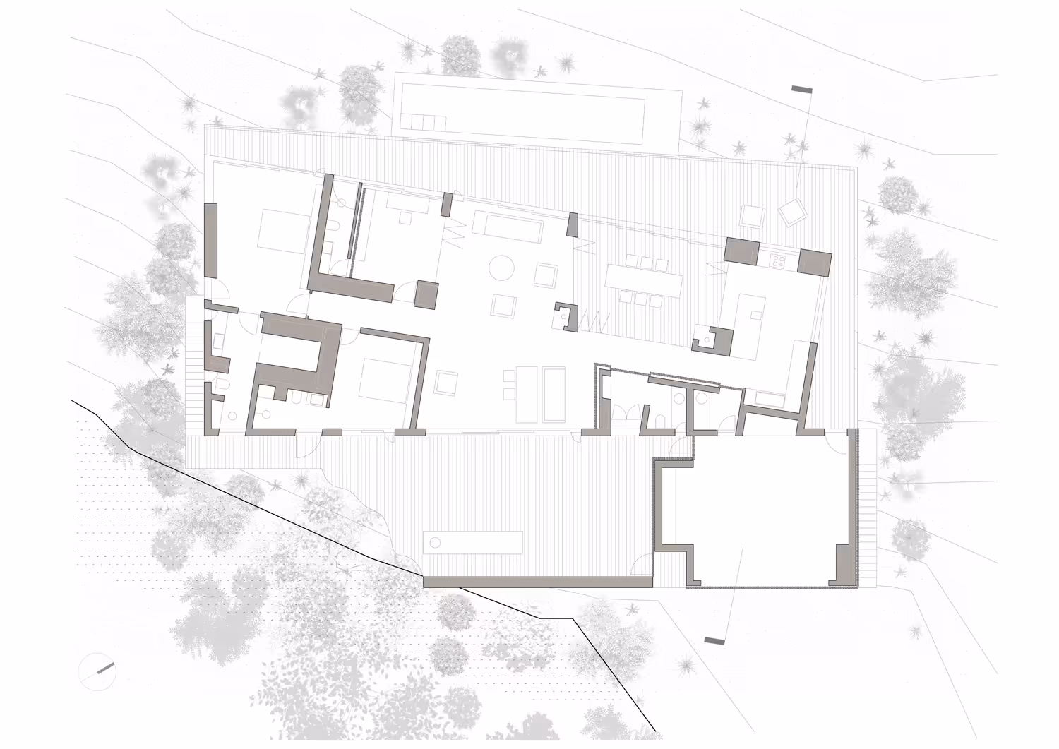 From the southeast, the house is expressed on slender concrete columns, elevating the structure to conserve the indigenous landscape below. Two concrete chimneys rise above, referencing the natural stone of the site while extending toward the sky. Timber slatted screens modulate light and ventilation, while the gently pitched roof, suggestive of a sail in plan and section, organizes the building’s form. At the entry, walls transition from stone to timber, establishing a layered materiality that articulates thresholds and spatial hierarchy. This duality is carried through the composition, balancing enclosure and openness, vertical and horizontal, solid and void, structure and tectonic expression, and the dialogue between mountain and sea. Internally, the retreat accommodates two en-suite bedrooms. One overlooks the ocean, while another is oriented to the mountain. A library with concealed door and secret bathroom can function as a third bedroom, but is primarily designed as a focused workspace for writing and contemplation. Interior finishes are carefully considered, with restrained material palettes and attention to proportion and detail. Living areas are arranged to mediate between terrain and view, offering multiple spatial experiences depending on weather and light. An internal deck with a translucent roof adjoins the kitchen, oriented toward the beach; two living spaces face the ocean from the mountain side; and a central corridor is aligned to capture winter sunlight through a roof split. Beneath the house, a pool provides an informal gathering space integrated with the slope. The retreat operates as an architectural exploration of balance: between land and sea, interior and exterior, privacy and openness, and the symbolic integration of opposing forces.